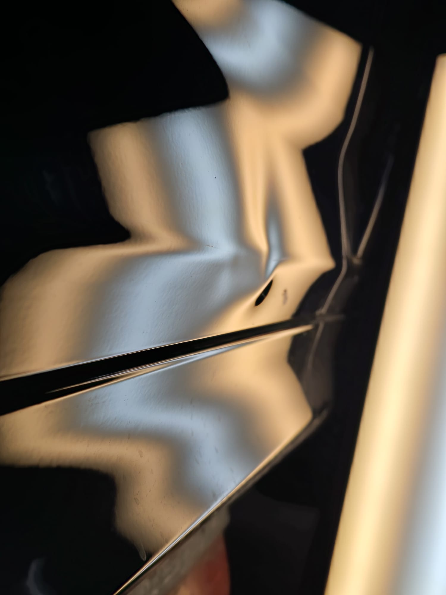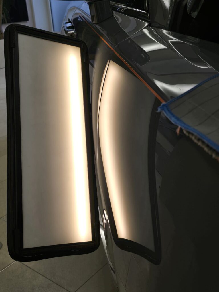 Der Schaden wird mit einem speziellen Reflektionslicht ausgemessen. So lassen sich selbst feinste Dellen sichtbar machen – präzise, verzerrungsfrei und millimetergenau.